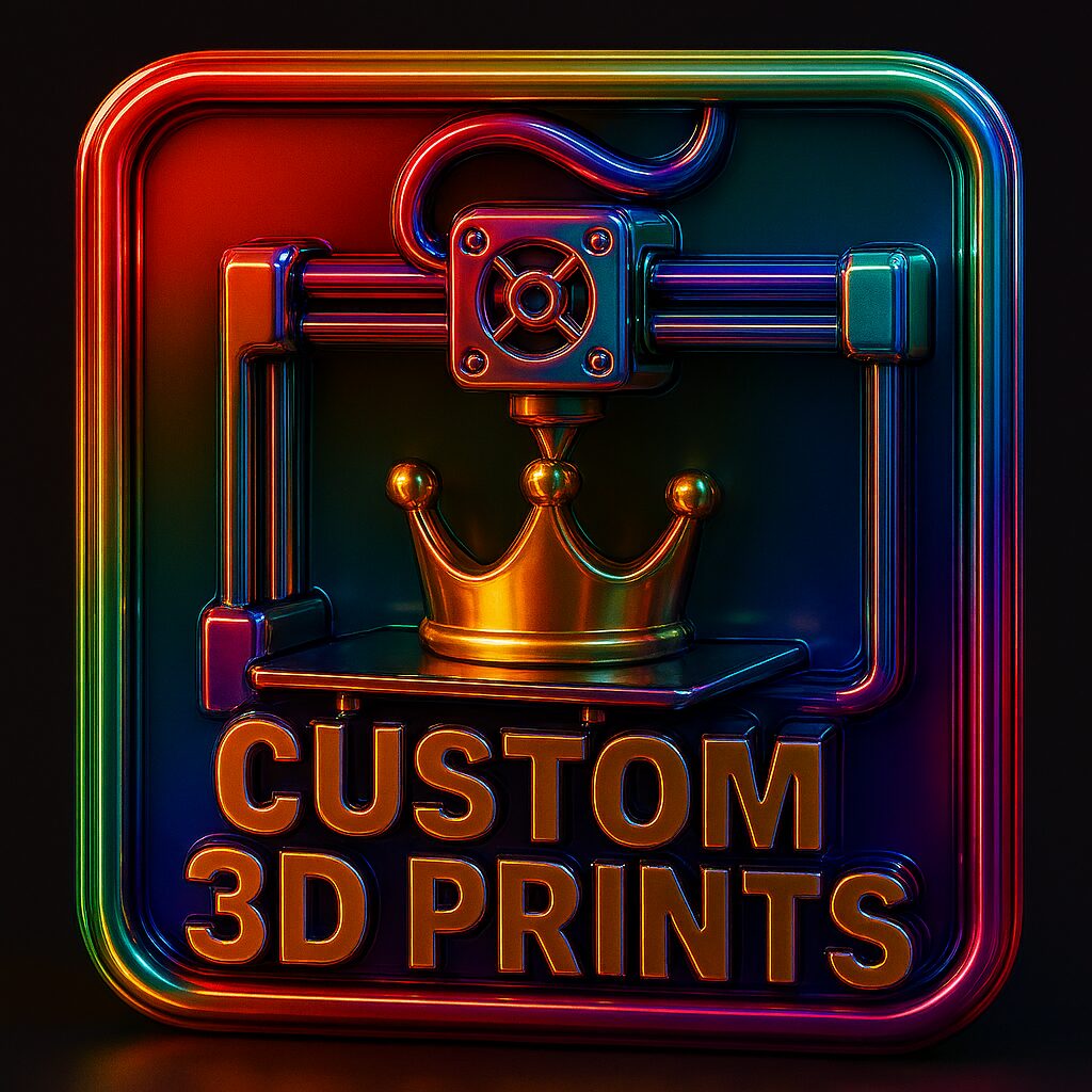 Bring your ideas to life with fully custom 3D prints. Whether you need a character, a logo, a crown, a prop, a badge, a nameplate, a figurine, or any creative concept within reason, we will design and produce a unique piece made just for you. Every project is crafted with care, detail, and collaboration to make sure the final result matches your vision.